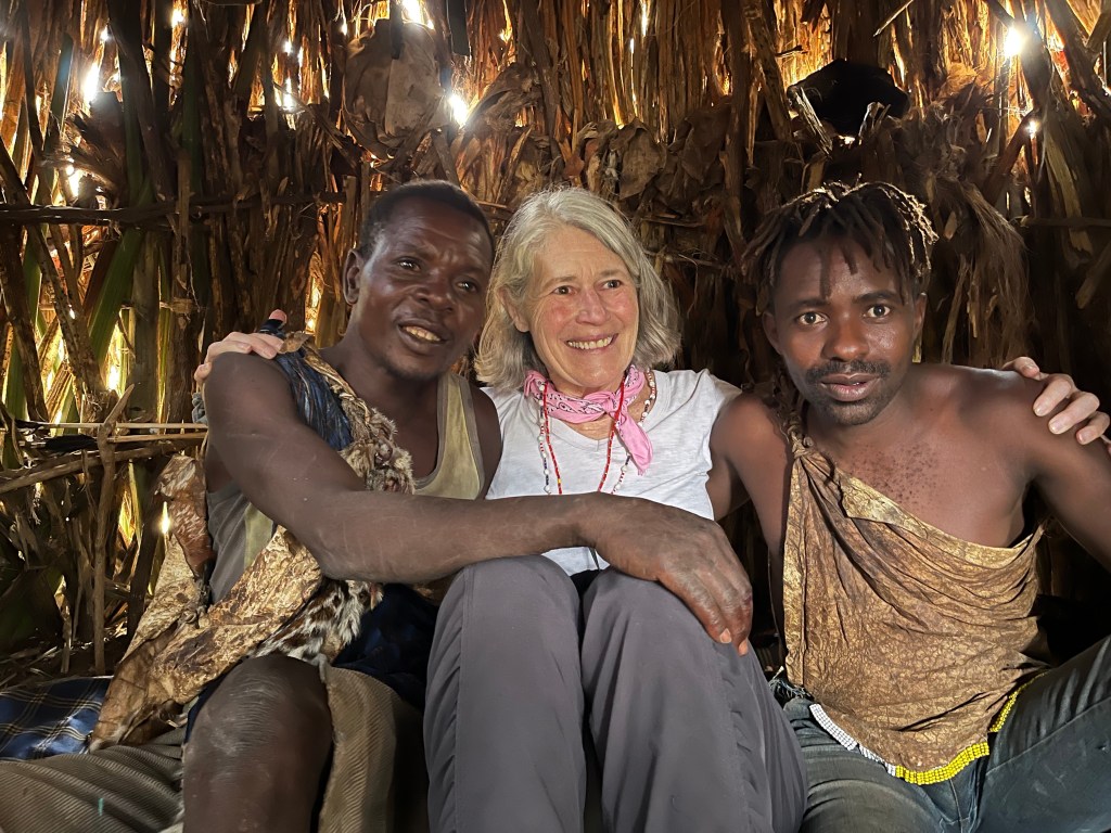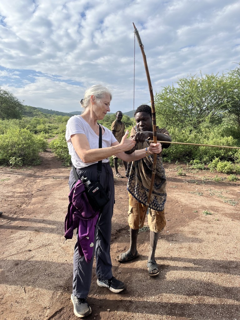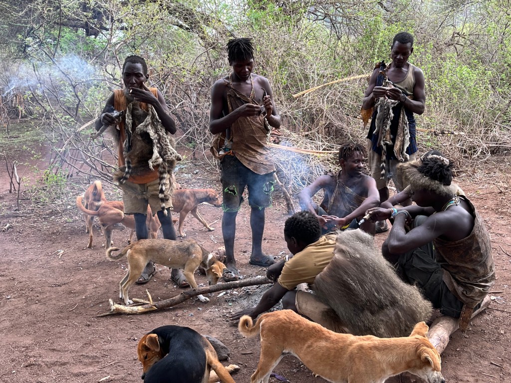 After a fabulous dinner we headed to bed with a 4:30 AM wake up call looming. A quick cup of coffee and we were off with our guide navigating the bush highway to the middle of nowhere. There we found the Hadzabe hunters around a fire, joking, laughing and passing around something suspicious. Our guide said “they like their happy smoke”! From the start they were super welcoming and fun.