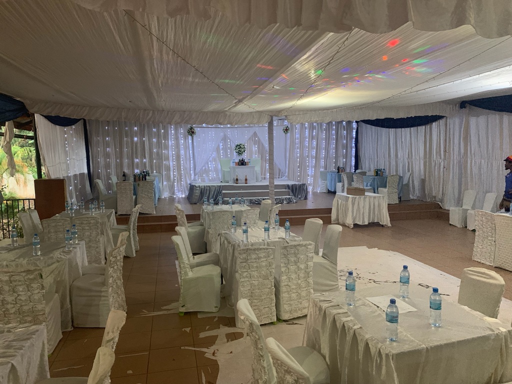 Although the guests had not arrived, the blaring dance music was right on time. The place was decorated for a royal wedding with even the chairs decked out and a high platform, bejeweled with lights, for Ivan and his wife.
