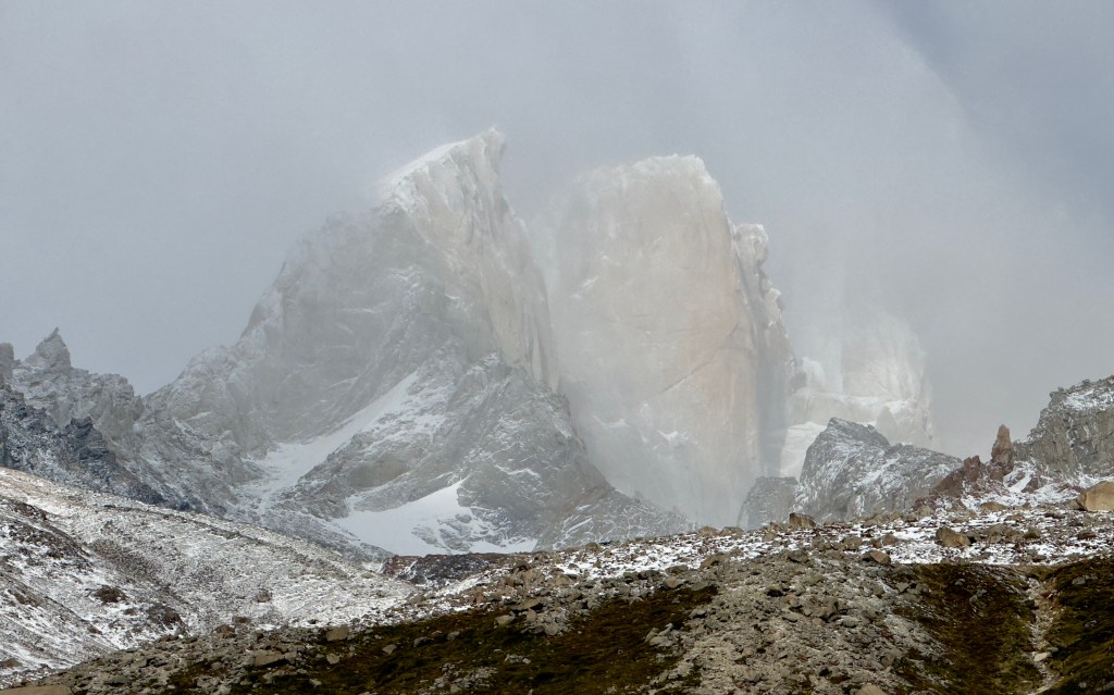 Better yet Paul and Lucho (both fabulous photographers) were hiking with me. Out of the forest along the river, we got several shots of a hazy Fritz Roy – lovely. Then BAM we came face to face with a boulder field on our path to the lake. From the beginning of the W, I had a pact with my knee. I could ignore the pain, only if I respected its hostile relationship with boulders. Paul wanted the lake, but I could only make it halfway through the boulders. So sorry Paul. We learned later that no one got all the way as there was an issue with the path.