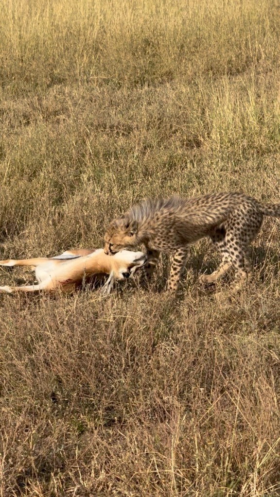 Her kill came with a price. She laid nearby to recover, her lungs heaving. It was clear she would need recovery time, so Anderson made fabulous coffee and we ate breakfast. The cub, still with baby teeth, dragged the gazelle around trying to get a bite.