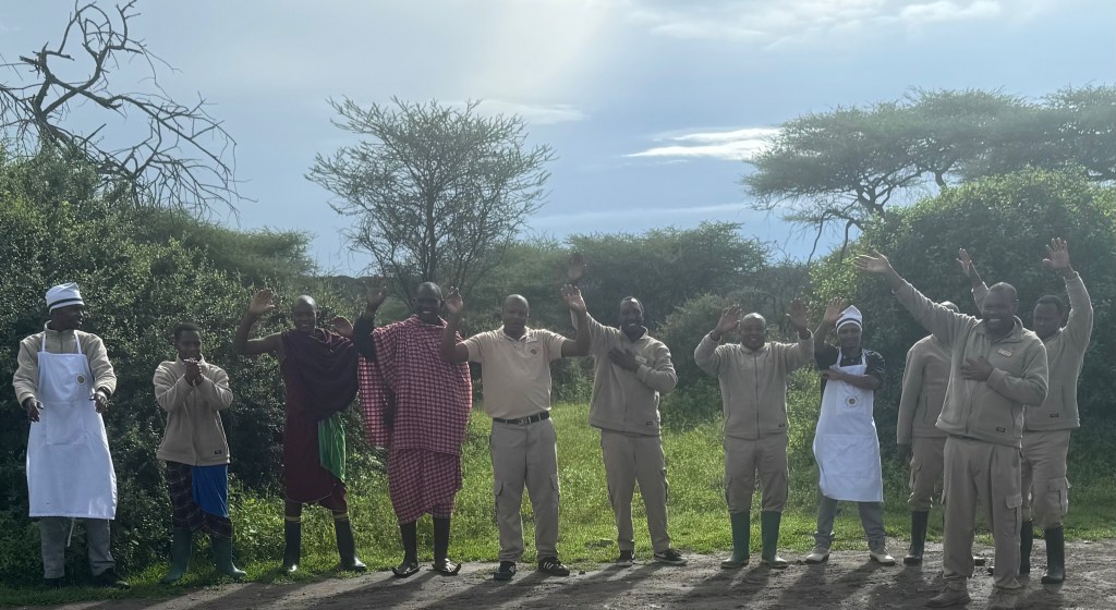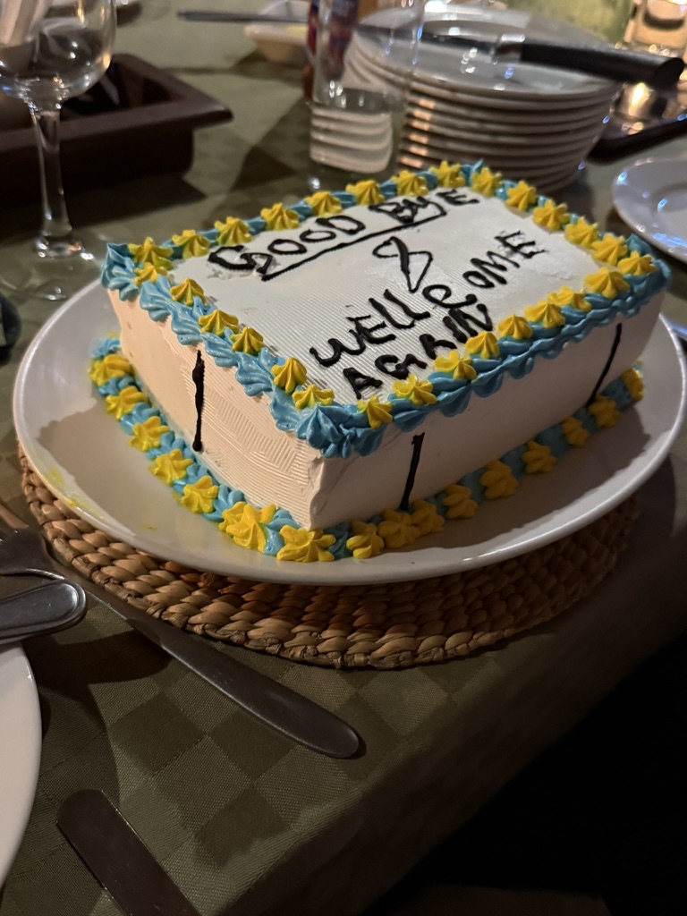 Our final dinner is delicious topped off by the staff singing our favorite Jambo song while dancing with pots and pans!  They presented me with a cake so, in the Tanzanian tradition, I could cut and serve to all.  We did heartfelt thanks and I outed our shoe cleaner for special thanks.