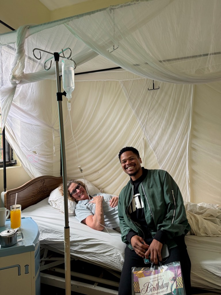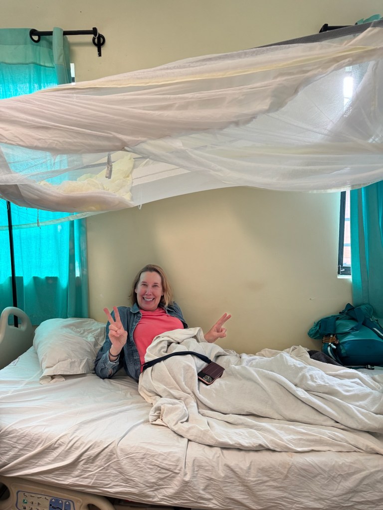Straight to ER, Lori was greeted by a fine line-up of FAME care givers headed by Dr. Elibaraka.  And eagerly supported by Jean and Kim.  After labs and set up on IV Lori was admitted to the ward where she could have a private room with extra beds.  Kim left early in the morning to get some sleep.  Jean stayed – well you know the story about her bed fetish!  In morning rounds Dr. Gabrial looked at both and said “Who is the patient?”.