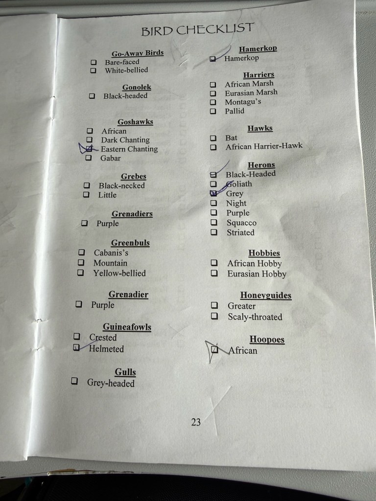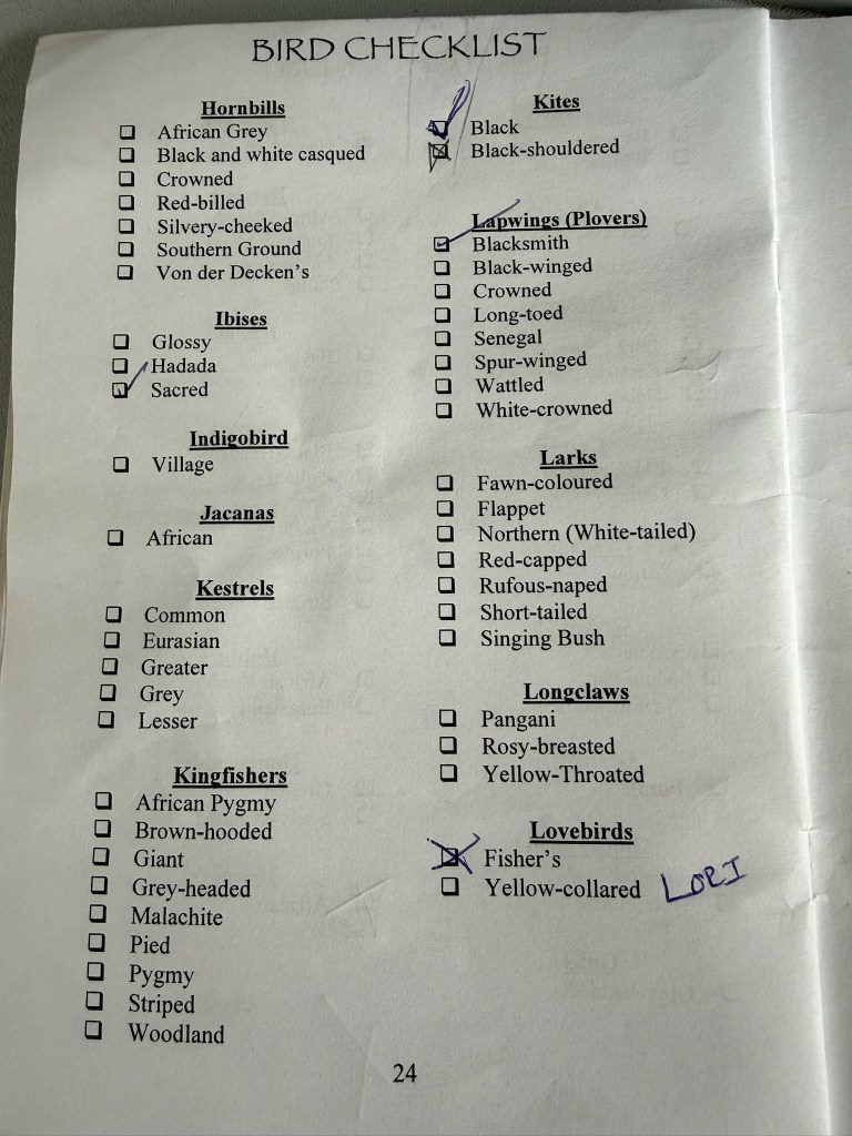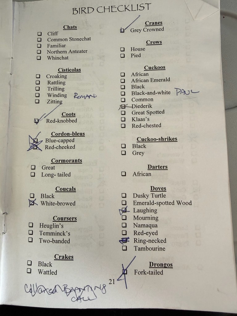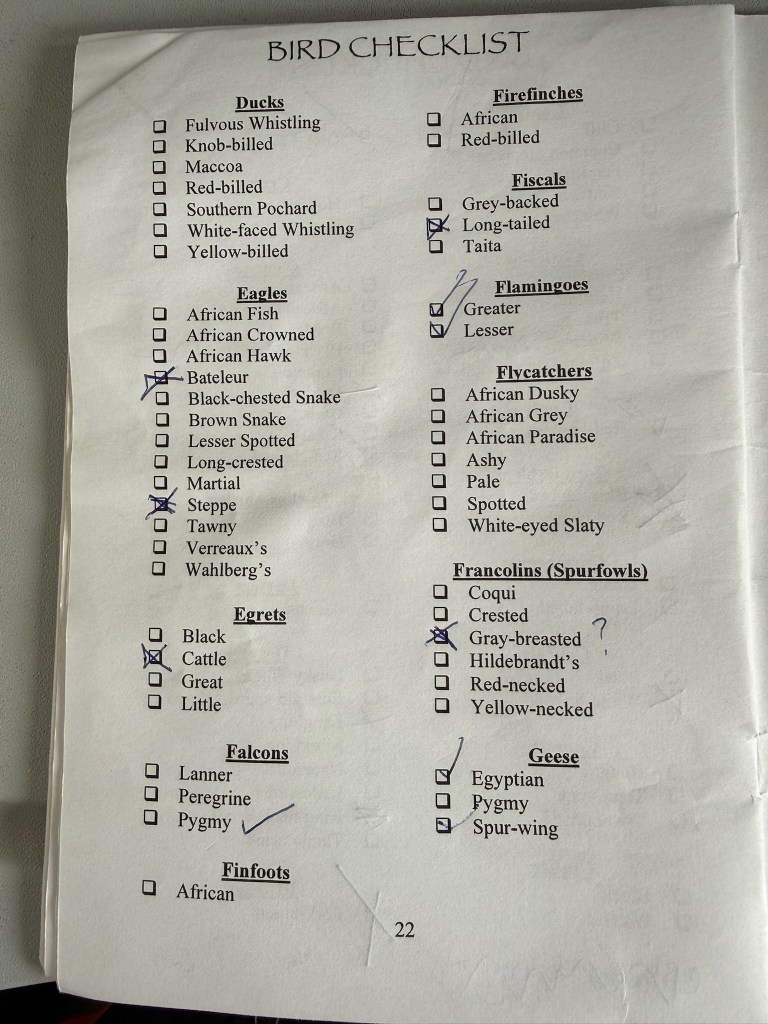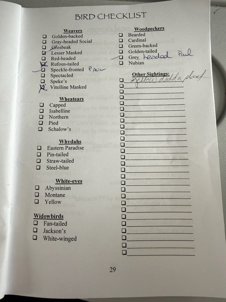 A woman of steeled insight and soft leadership, Bridgid organized with the group, the greatest gift to me –  completion of the FAME laundry.  Thanks to her, we also have a full accounting of the birds we saw and Paul photographed.  Although, not her first trip to Africa, she approached every crazy part of it with fresh eyes and glee.