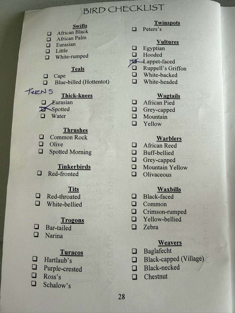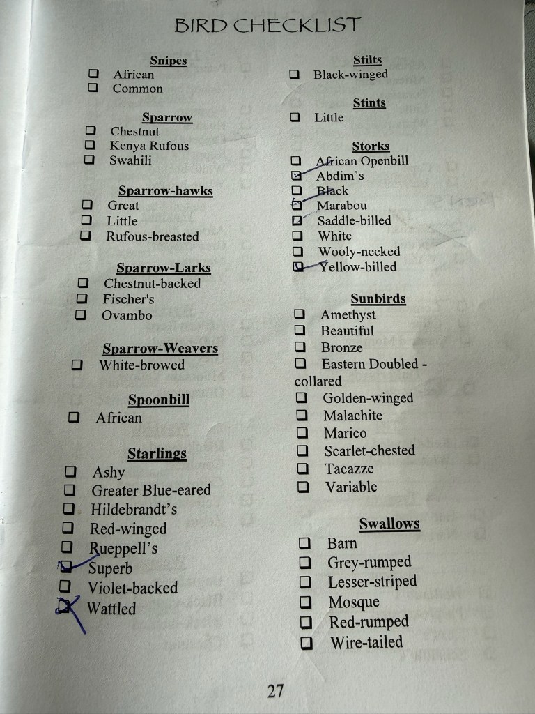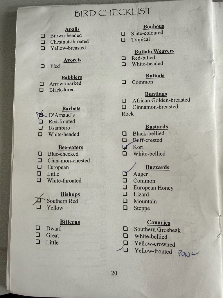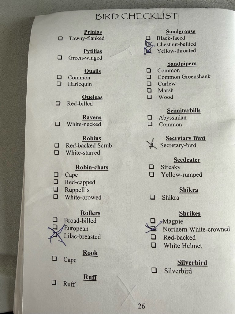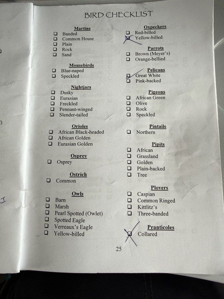 A woman of steeled insight and soft leadership, Bridgid organized with the group, the greatest gift to me –  completion of the FAME laundry.  Thanks to her, we also have a full accounting of the birds we saw and Paul photographed.  Although, not her first trip to Africa, she approached every crazy part of it with fresh eyes and glee.