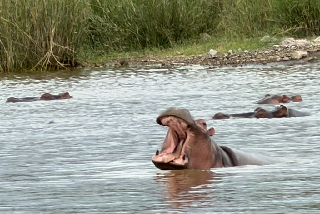Our lunch was at the hippo lake where we photographed dental work of the ugly beasts when they surfaced for air.  After a quick walk to the coffee van for a delicious cappuccino, black rhino and hippo out of water (REALLY?) guided us out of the crater and on to the beautiful Plantation lodge.