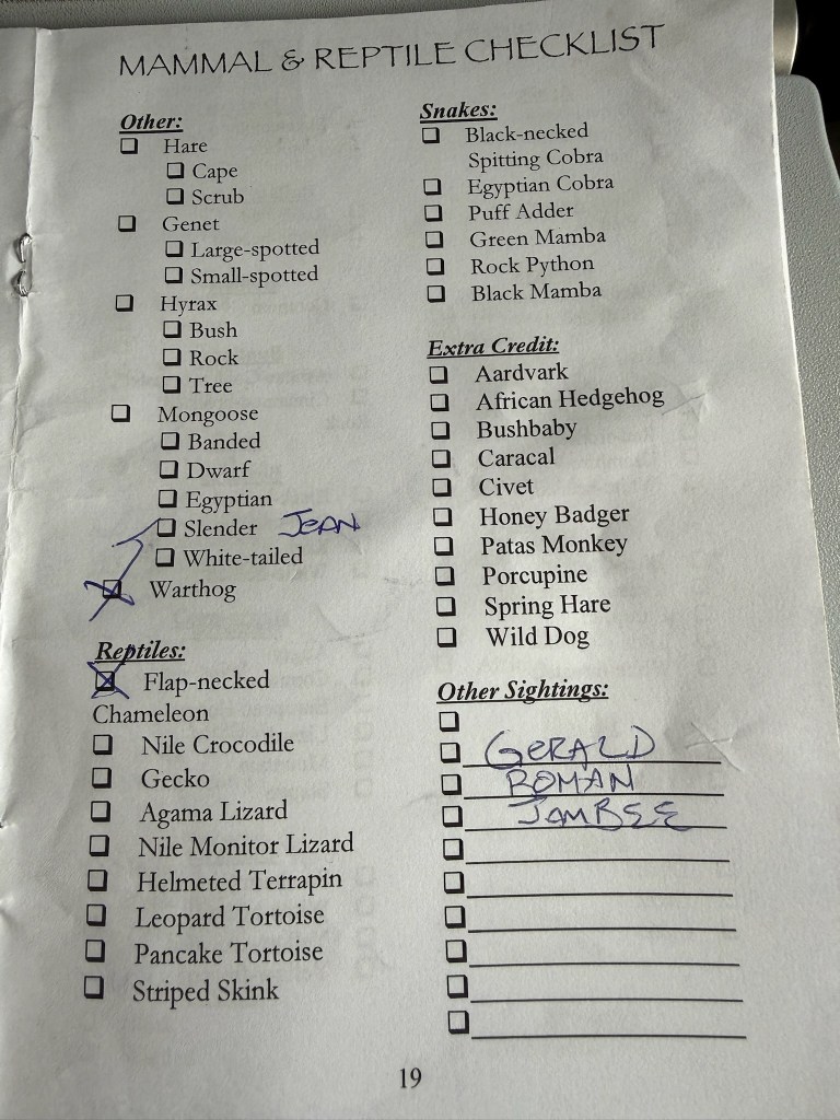 All but two, were virgin safari-ans.  This gave me the opportunity to see everything with fresh eyes.  After 9 years of safaris, this was a gift.  It was watching their eyes light up at the first giraffe sighting or the chatter at the end of a lion-filled day.