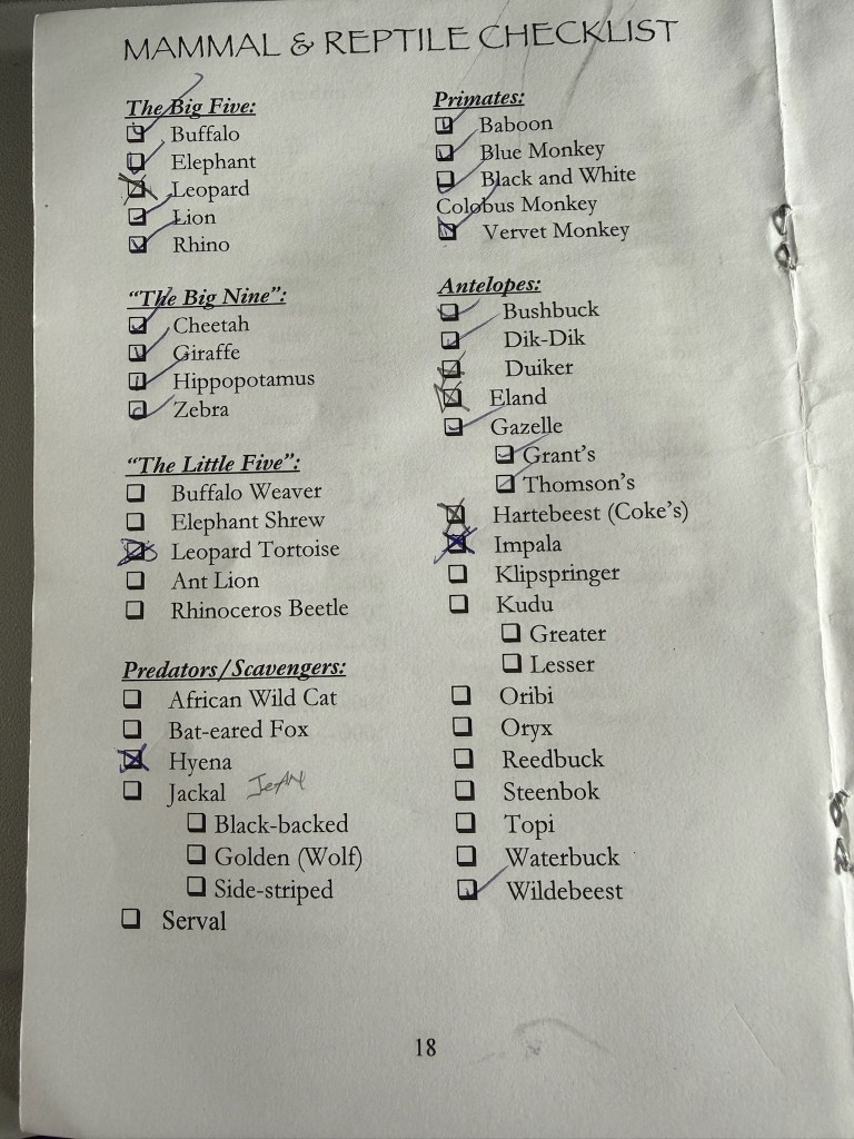 And we saw them all, elephants, lions, hippo, a resident herd of wildebeest, zebra, various gazelles,  baboons and more  birds.  Paul was photographing every bird and Brigid was tracking them in our animal count book. Thank you Brigid!
